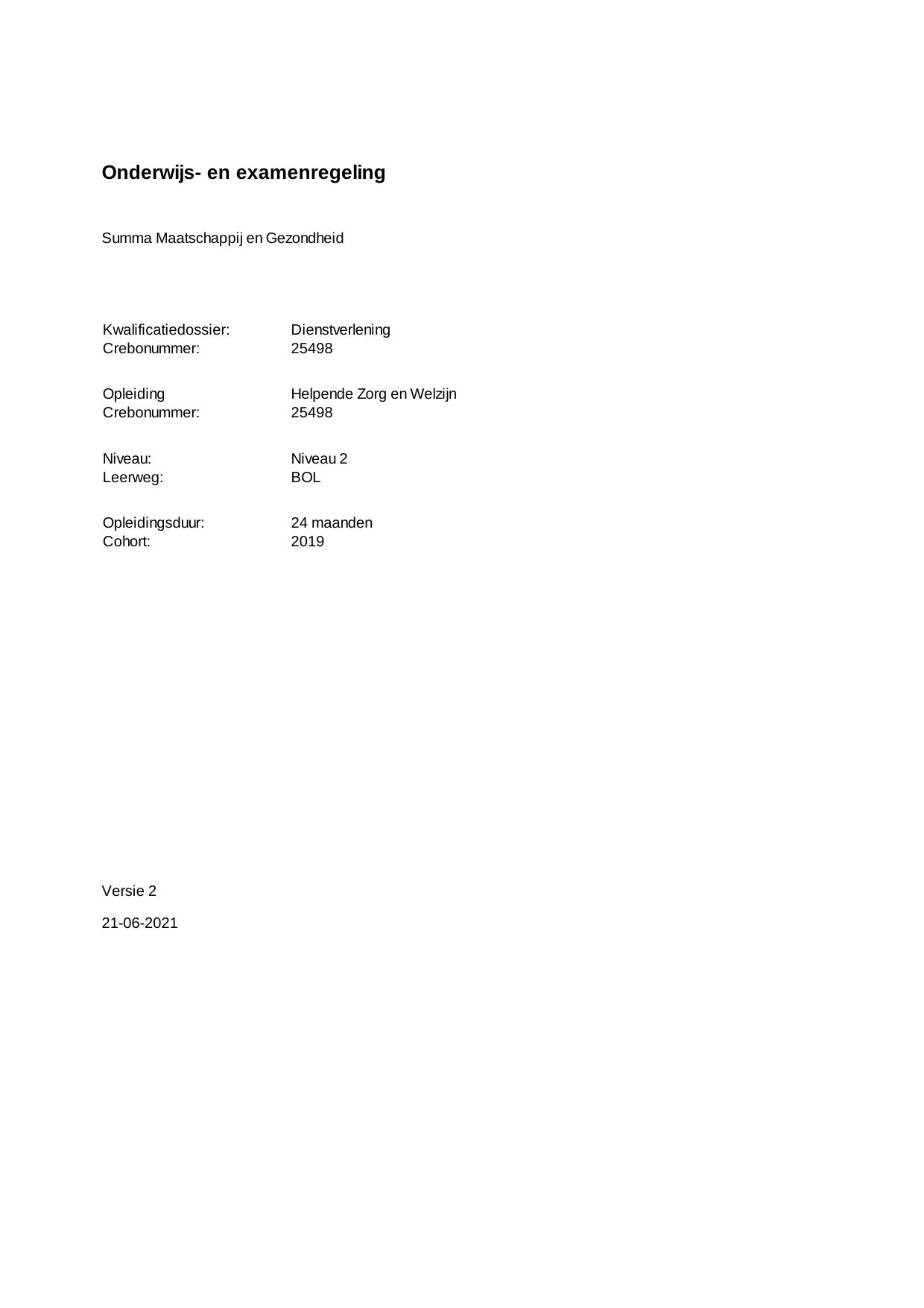 Helpende Zorg en Welzijn 25498BOL24.01 in cohort 2019-2020